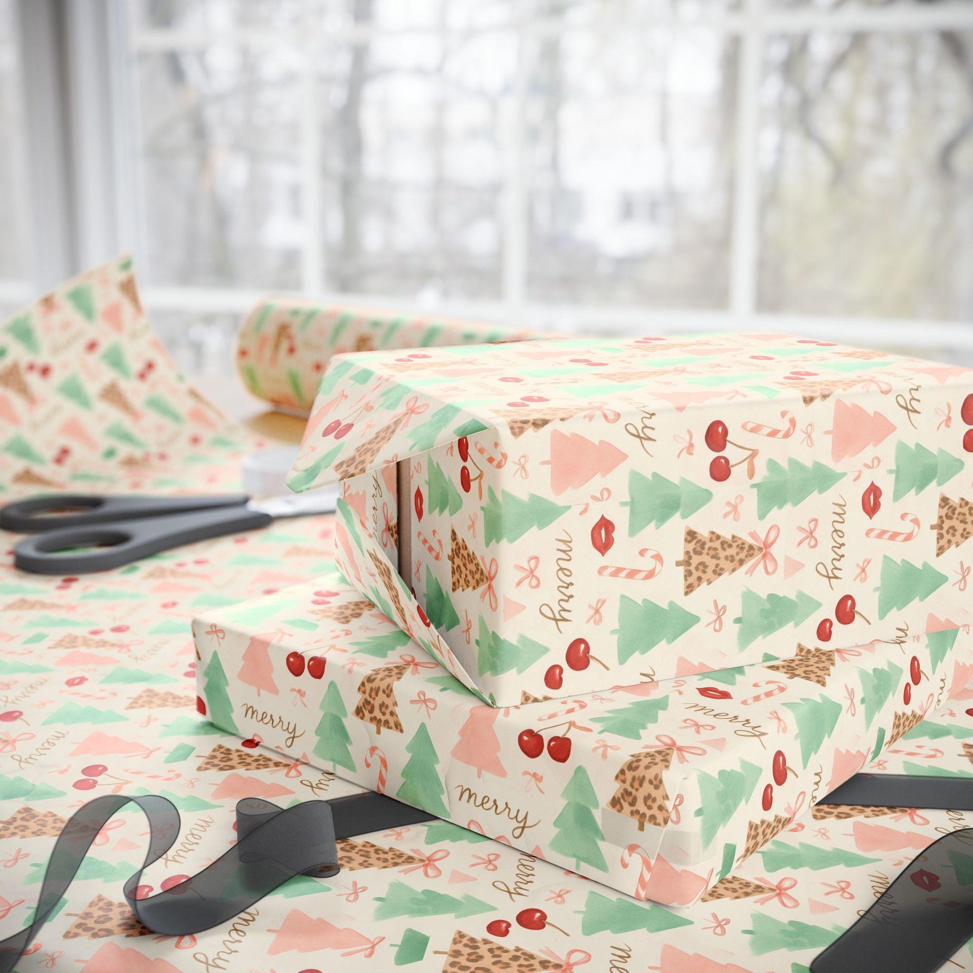 This playful wrapping paper combines holiday cheer with coquette flair. The design features watercolor Christmas trees in shades of blush pink, mint green, and leopard print, along with cherries, candy canes, red lips, and dainty bows. It’s a fun, girly twist on classic Christmas style — perfect for wrapping gifts for best friends, fashion lovers, or anyone who adores a bold yet feminine holiday aesthetic. The soft pastel tones and modern details make this paper a standout choice for stylish, Instagram-worthy gift wrapping.
