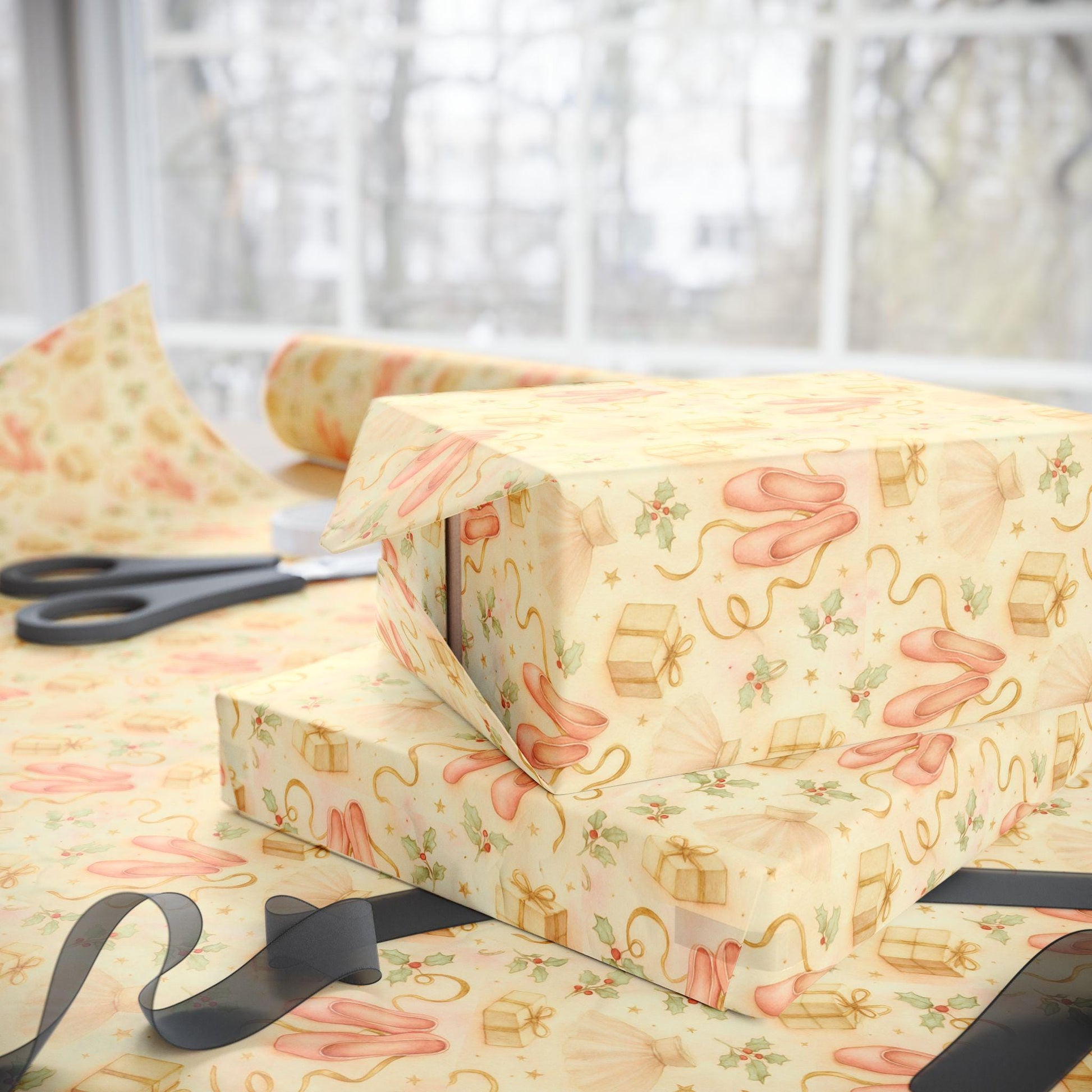 This dreamy wrapping paper captures the magic of the Nutcracker Ballet in soft watercolor tones. Featuring delicate ballet slippers, twirling tutus, golden ribbons, and festive gift boxes, this design brings a touch of elegance and nostalgia to your holiday gifts. The blush pink and champagne palette evokes a timeless coquette charm perfect for dancers, dreamers, and anyone who loves a soft, romantic Christmas aesthetic. Ideal for wrapping gifts for ballerinas or adding a graceful touch to holiday decor.