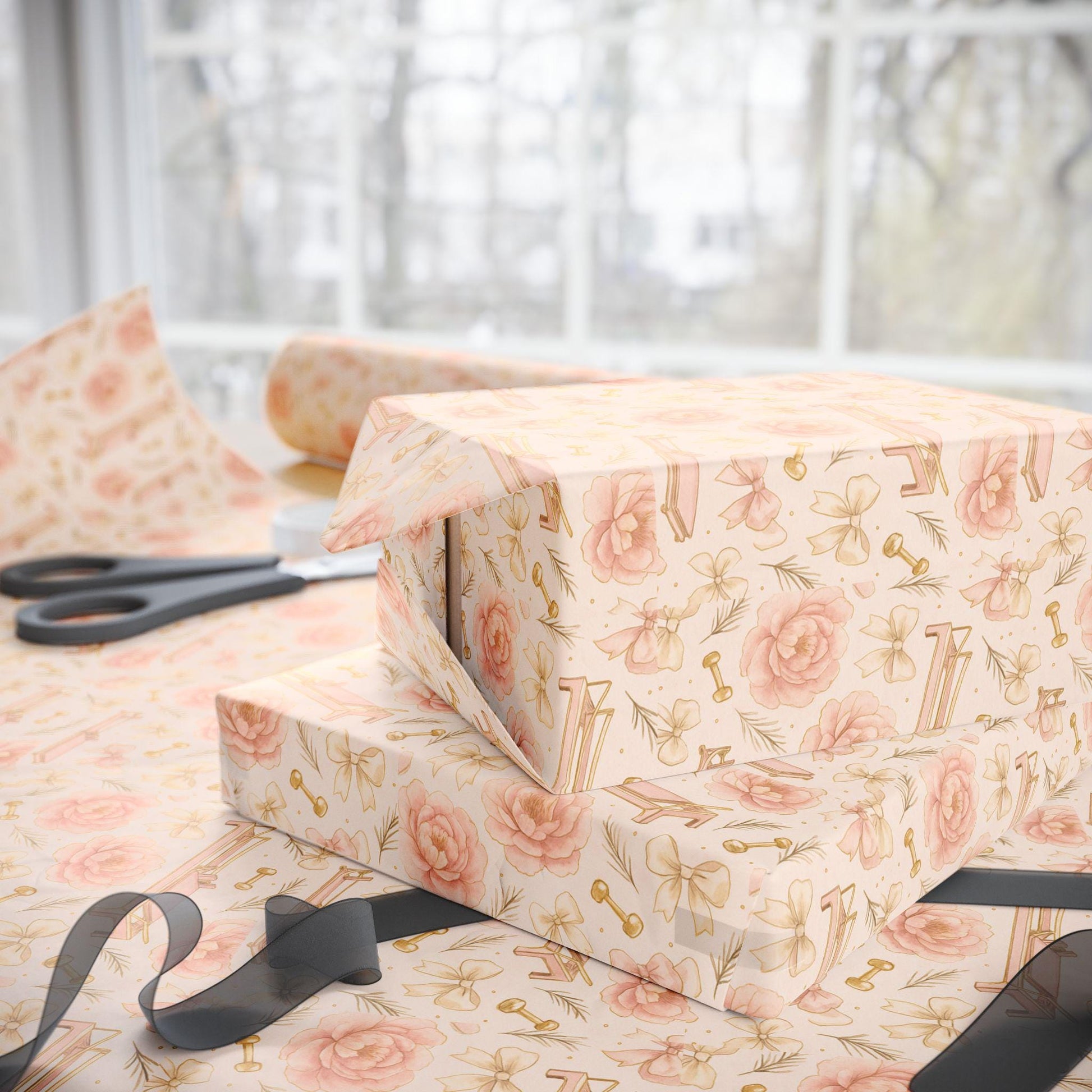 Pink Pilates Princess Wrapping Paper, Watercolor Pink Peonies & Dumbbells, Soft Girl Aesthetic, Gold Details, Gym Lover Gift, Pilates Decor