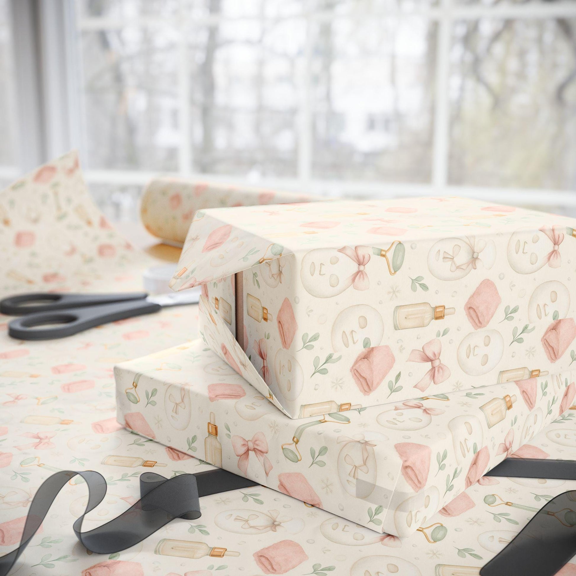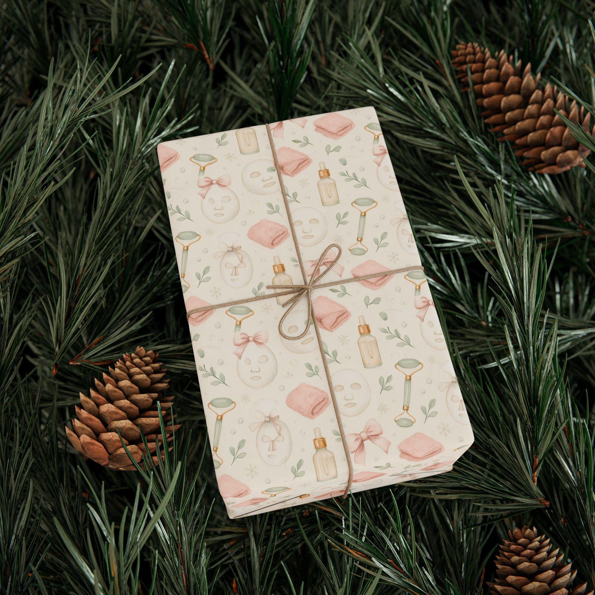 Watercolor spa skincare theme wrapping paper featuring face masks, pink towels, perfume bottles, bows, and jade rollers on a cream background. Clean girl aesthetic with a relaxing self-care vibe, perfect for adding a touch of luxury to gift wrapping. Ideal for those who enjoy pampering themselves and self-care routines. Relevant for birthdays, holidays, and special occasions.